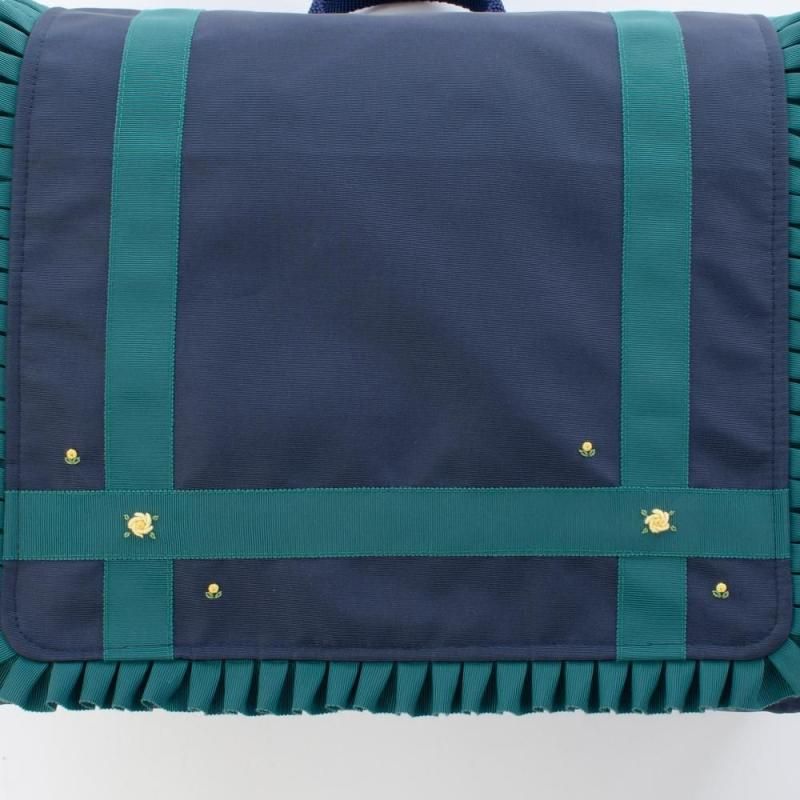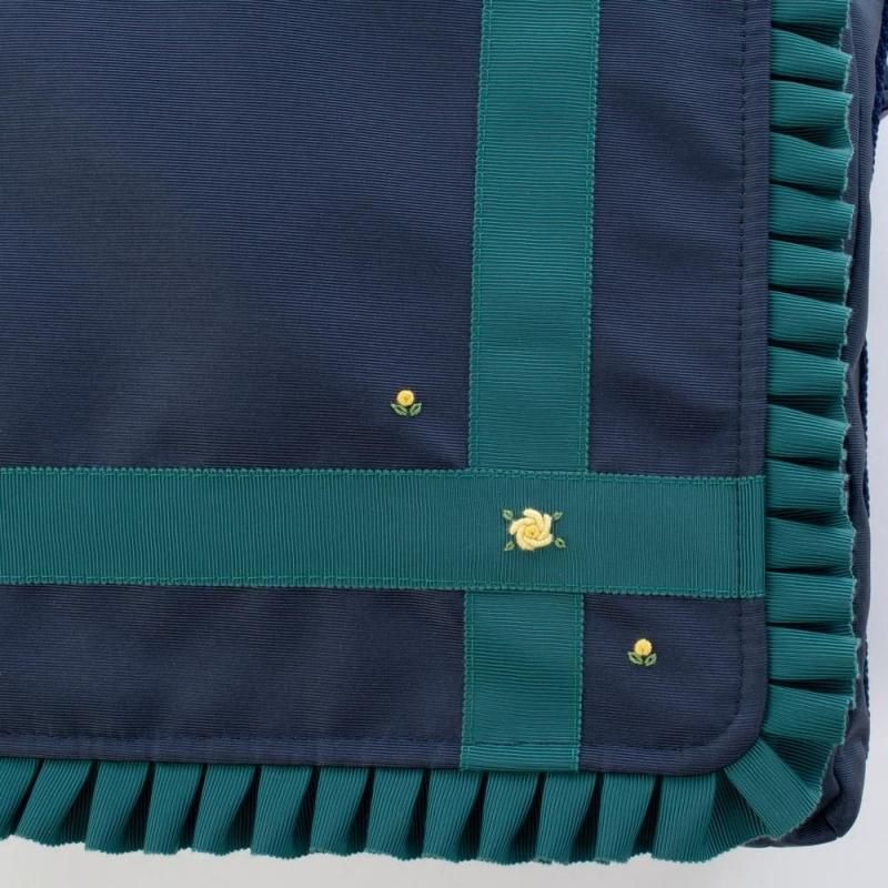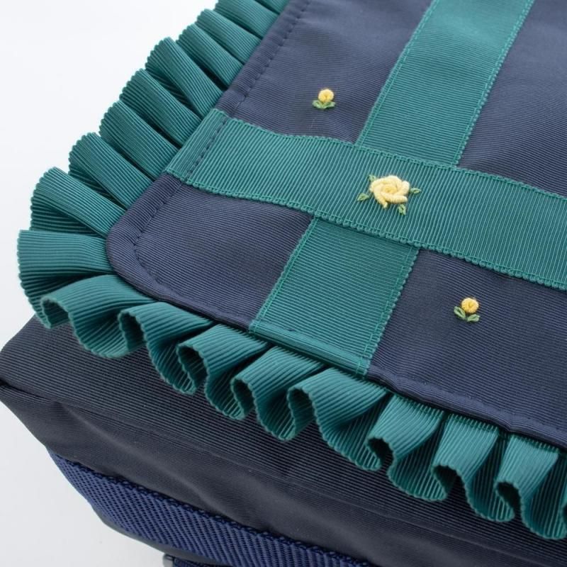 かぶせふたにはオリジナルカラーのテープ、フリル、刺繍をあしらいました。
