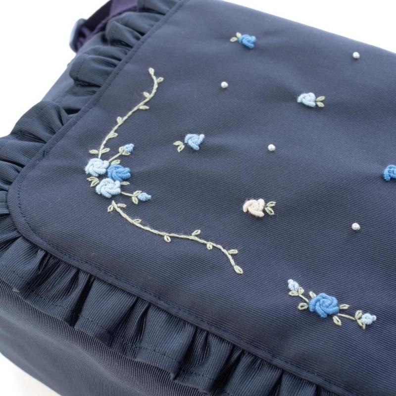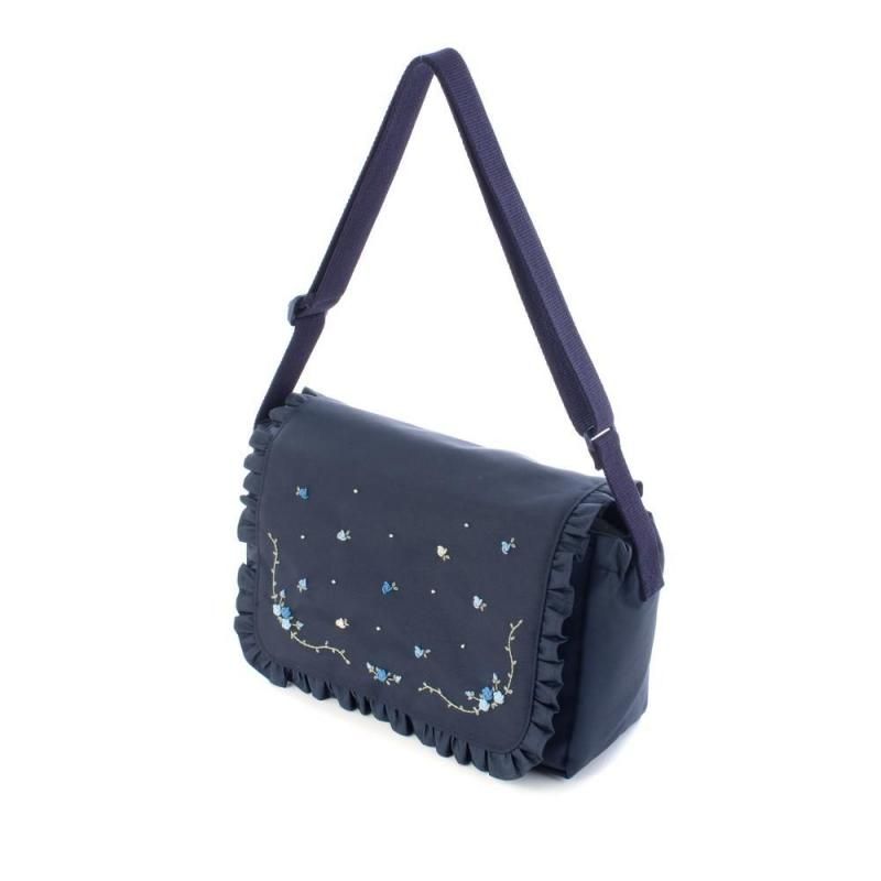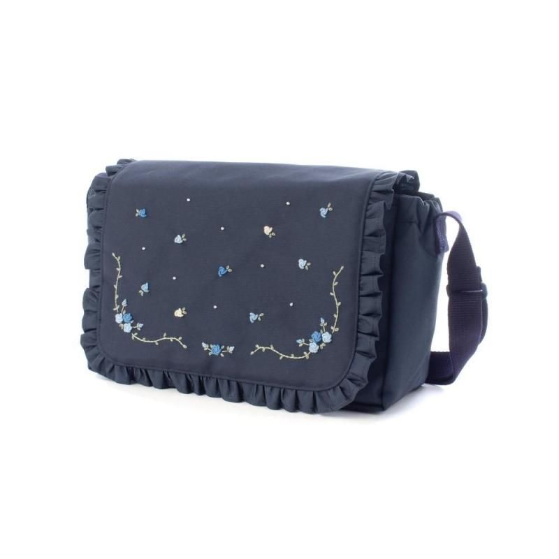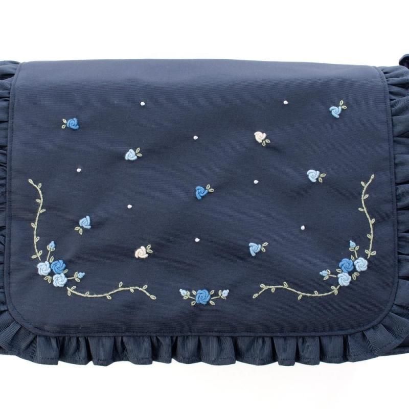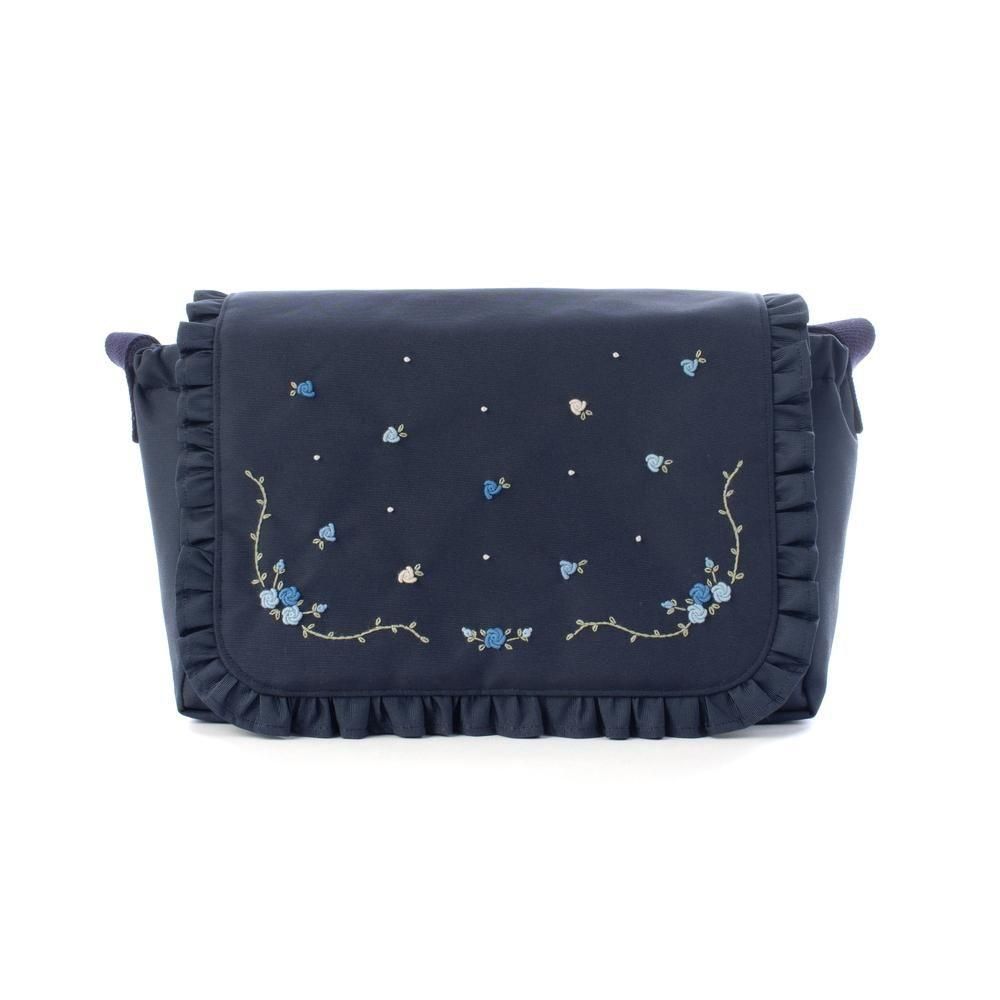 小さな青い花と蝶の刺繍が、繊細にきらめく通園用お弁当ショルダーです。