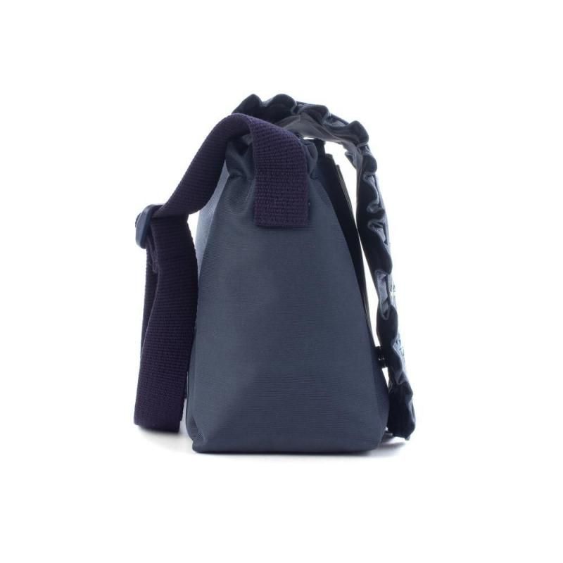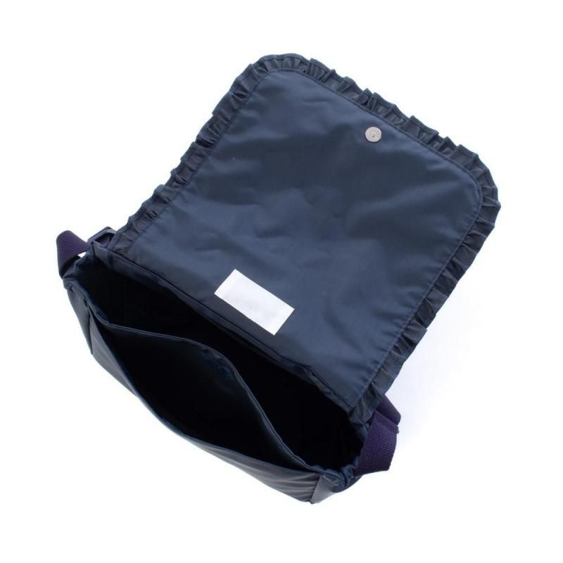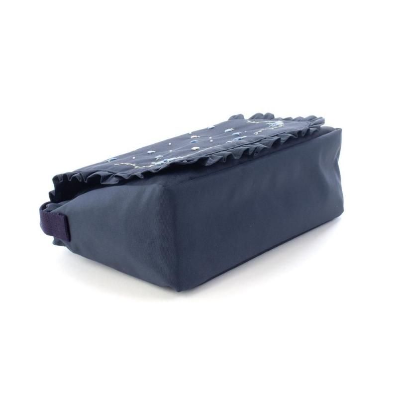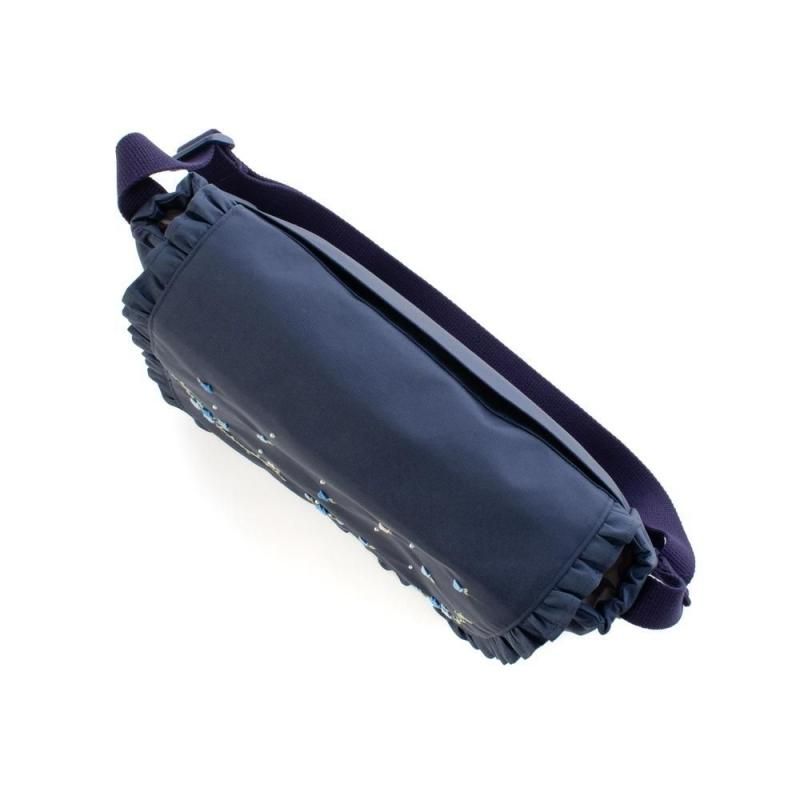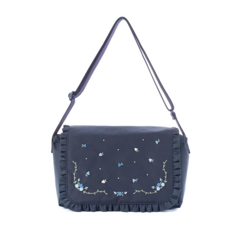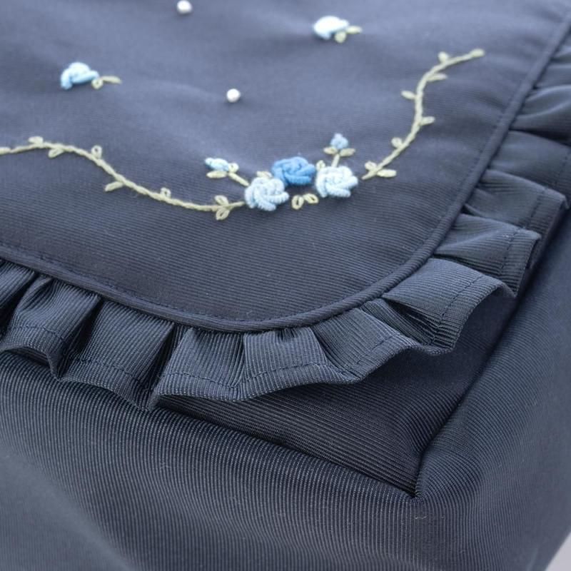 小さな青い花と蝶の刺繍が、繊細にきらめく通園用お弁当ショルダーです。