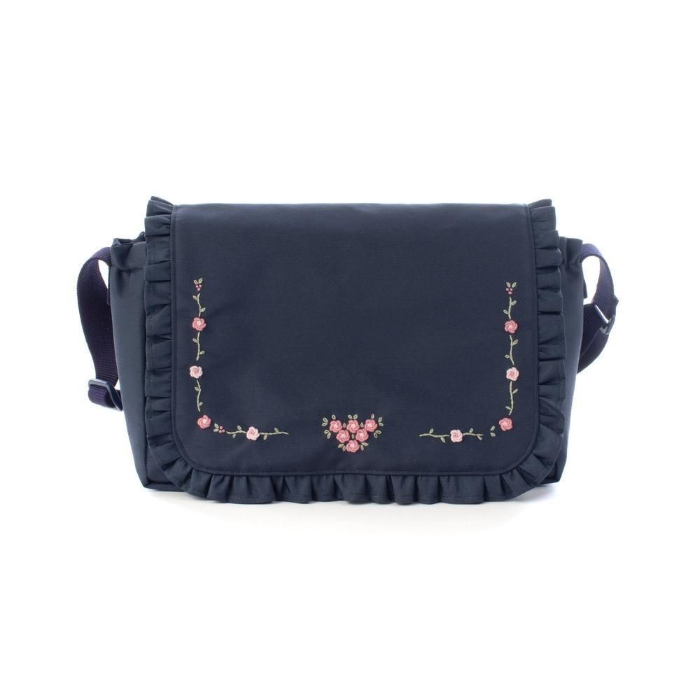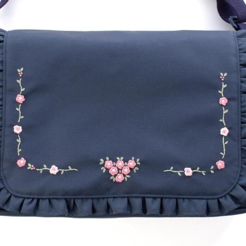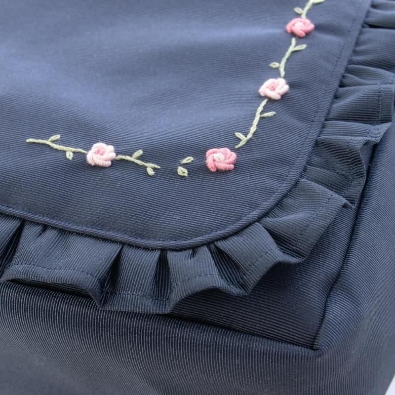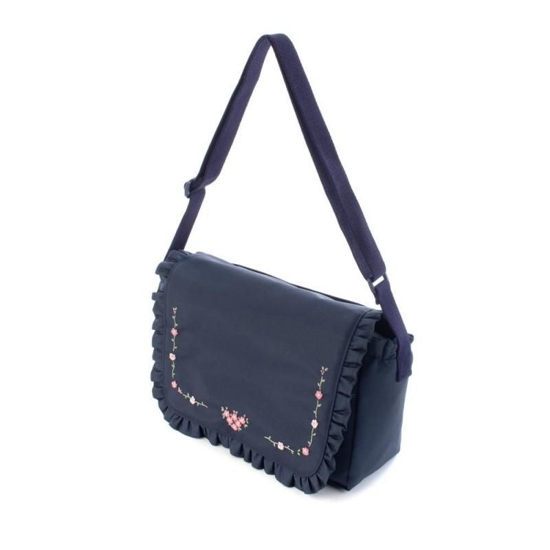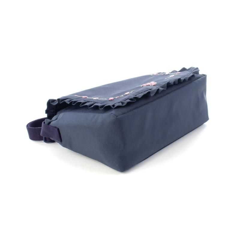 ネイビー地に淡いピンクの小花刺繍をあしらったショルダーバッグ。