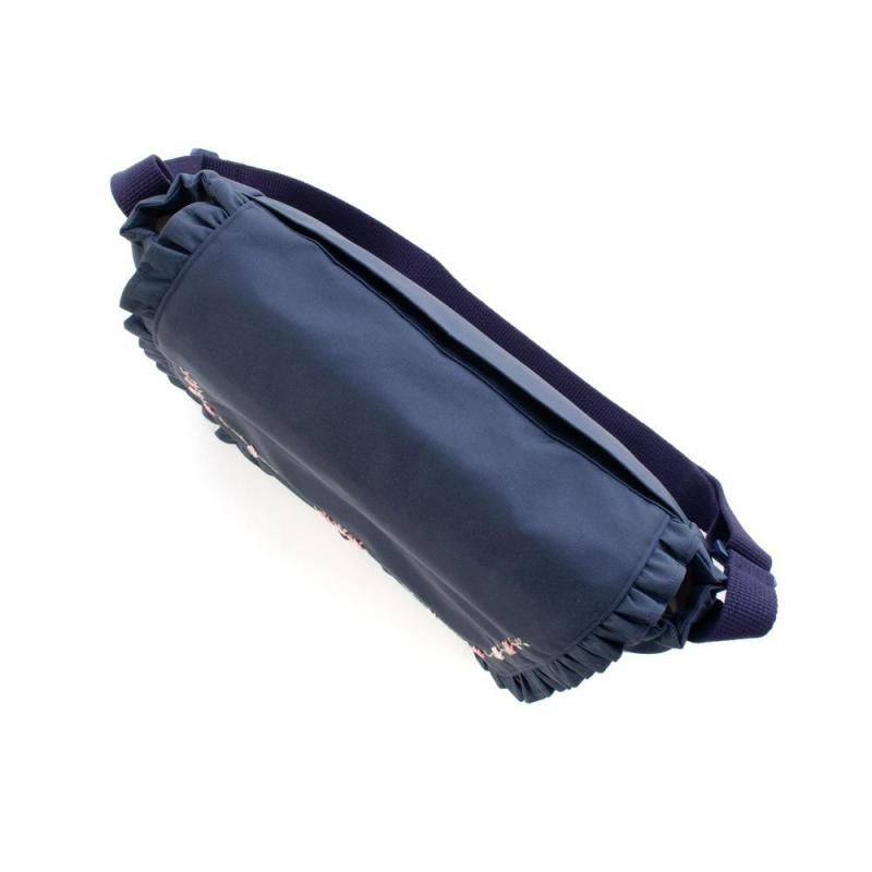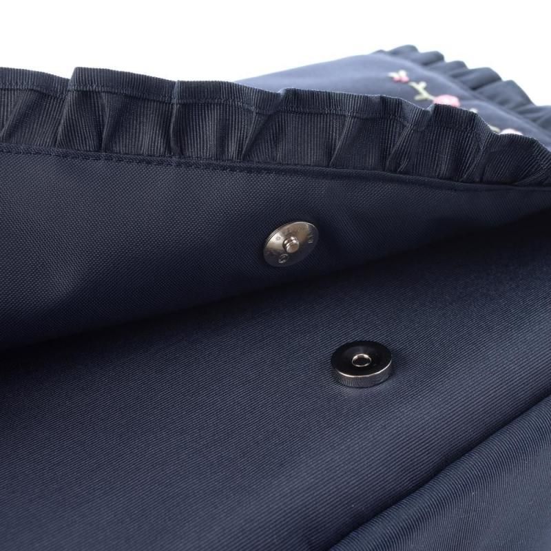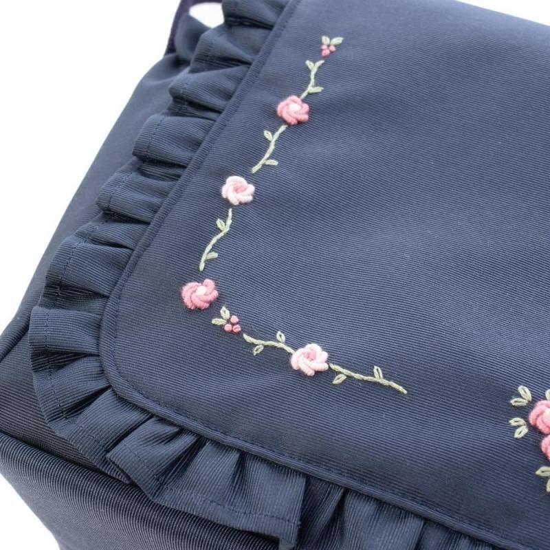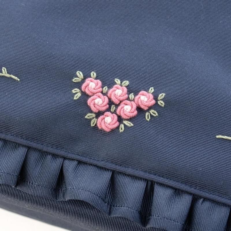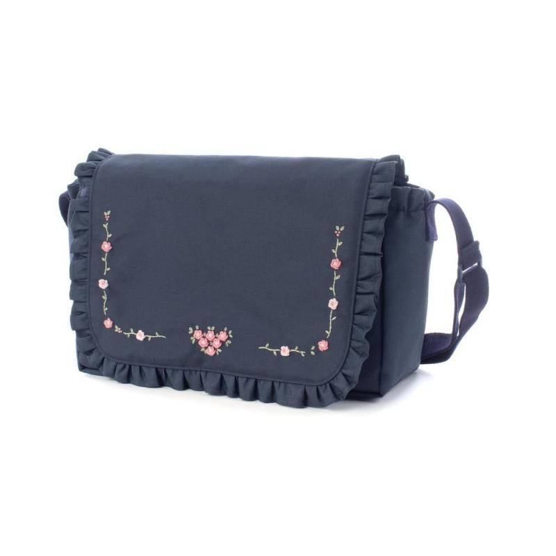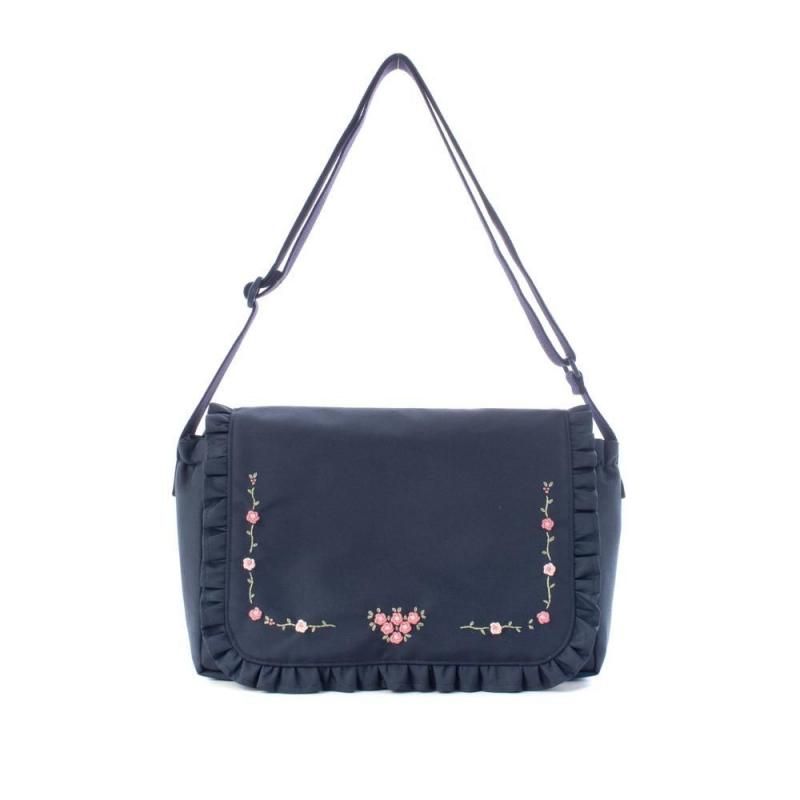 ネイビー地に淡いピンクの小花刺繍をあしらったショルダーバッグ。