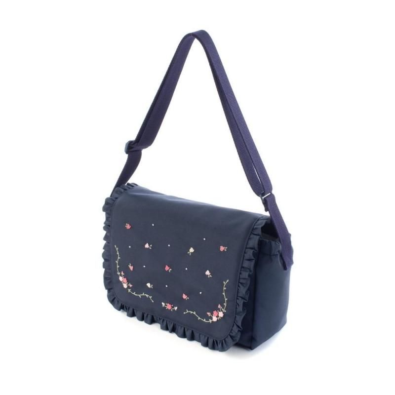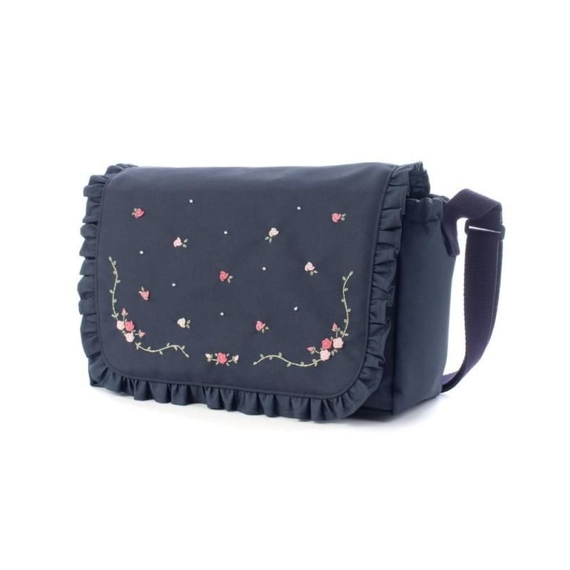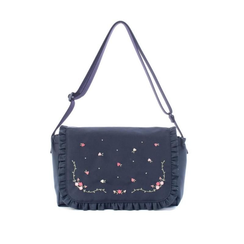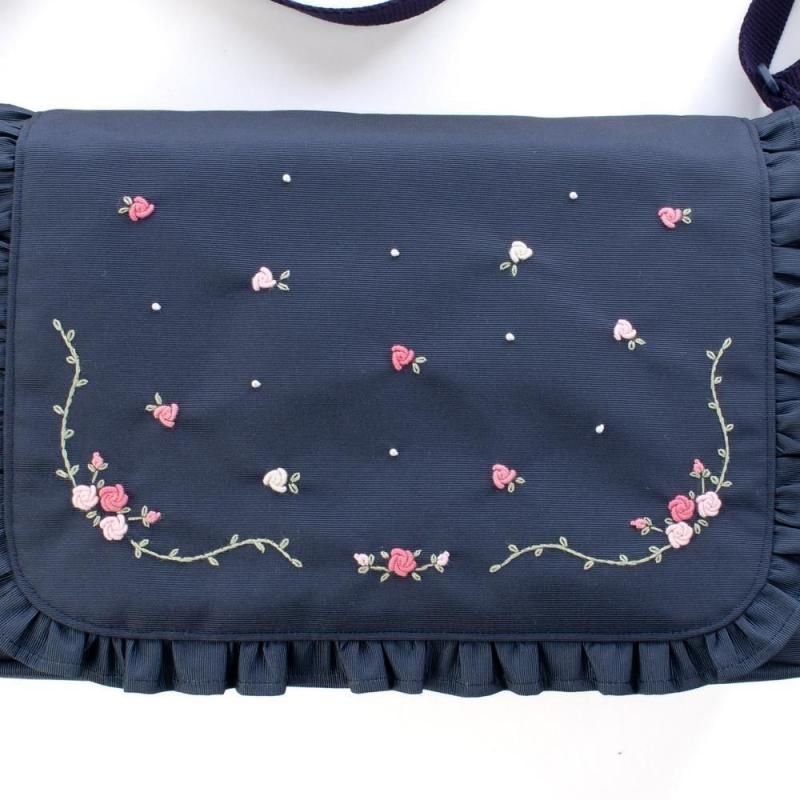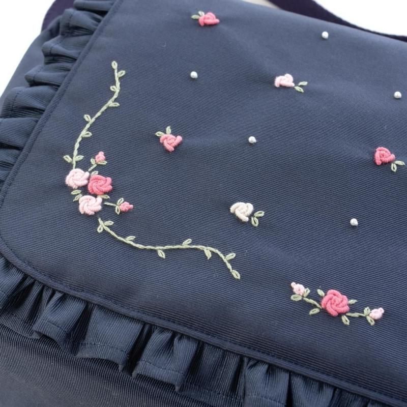 ネイビー地にピンクの小花刺繍をあしらったショルダーバッグ。