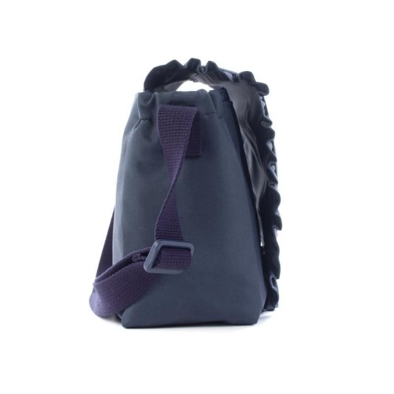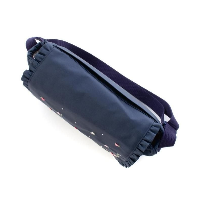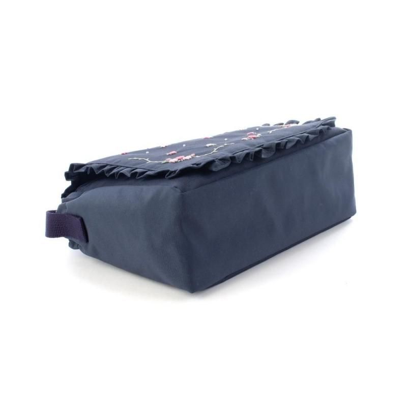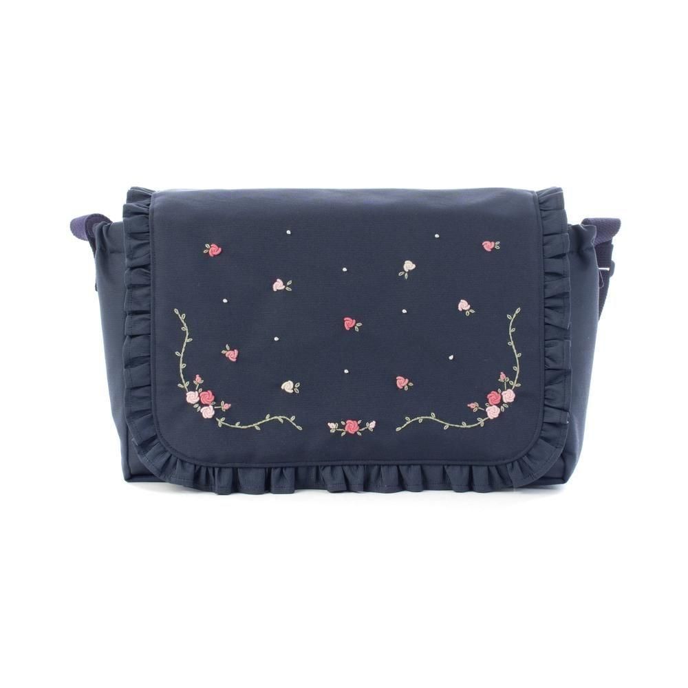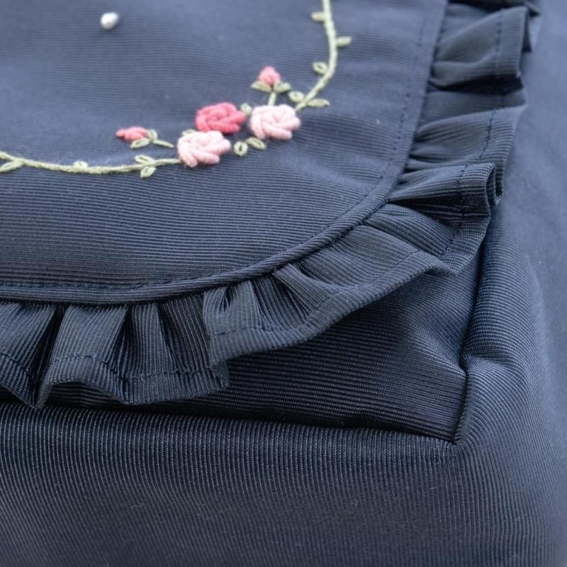 ネイビー地にピンクの小花刺繍をあしらったショルダーバッグ。