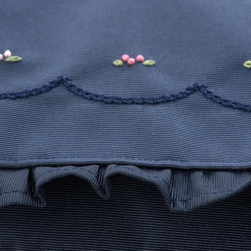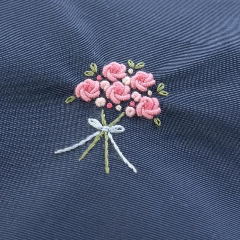紺のグログラン地紋にスカラップをあしらい、ピンクの花束のお刺繍を施しました。
