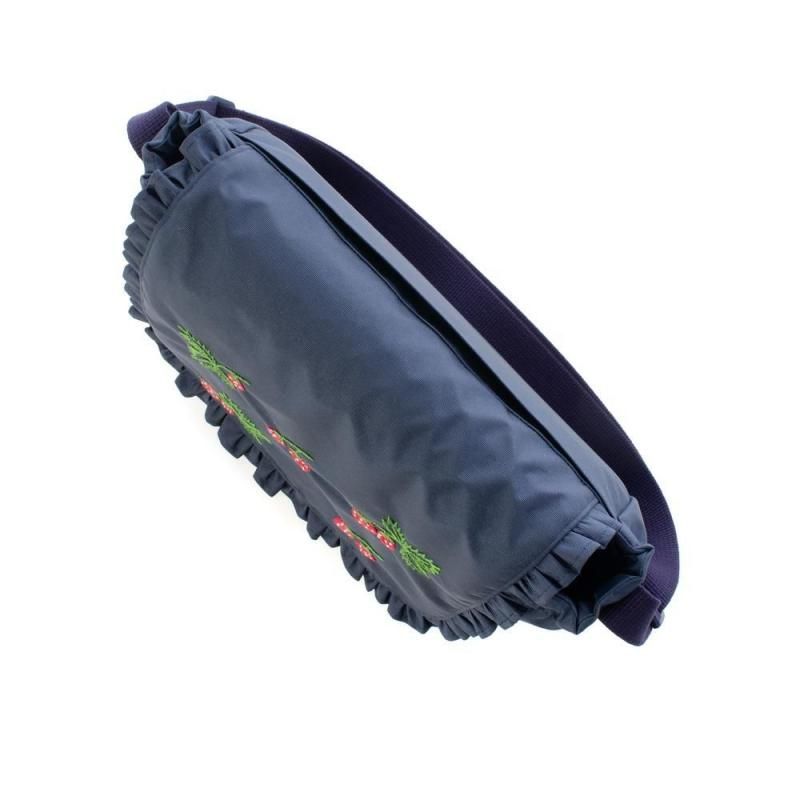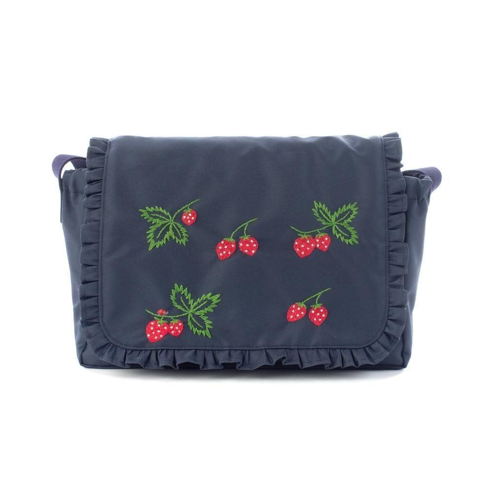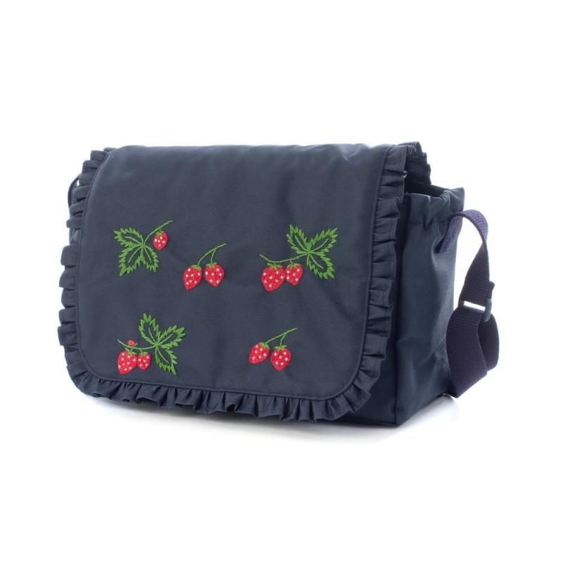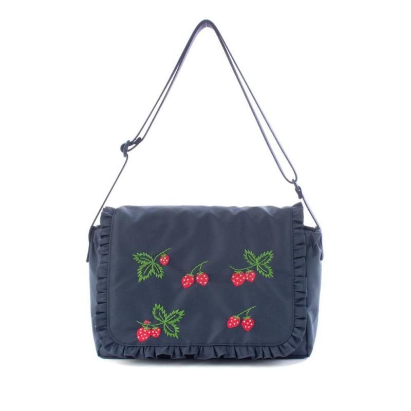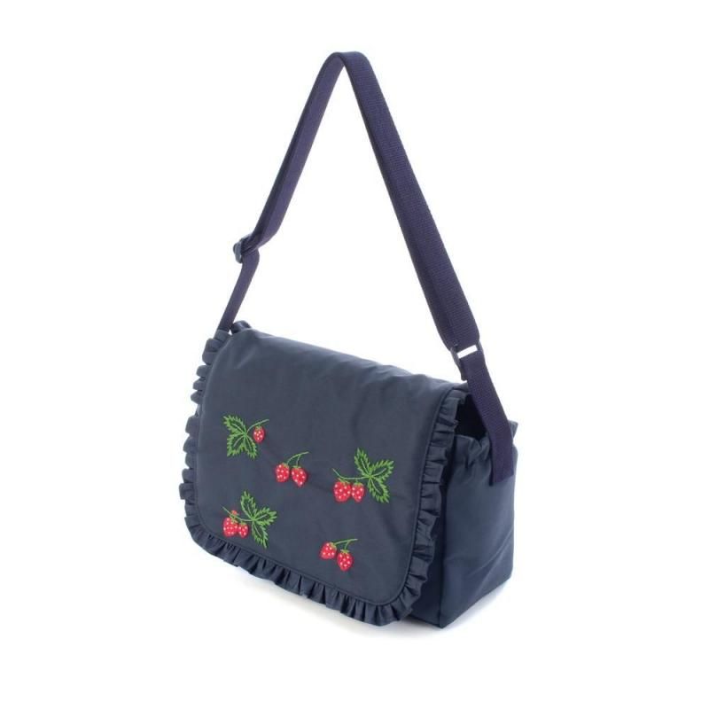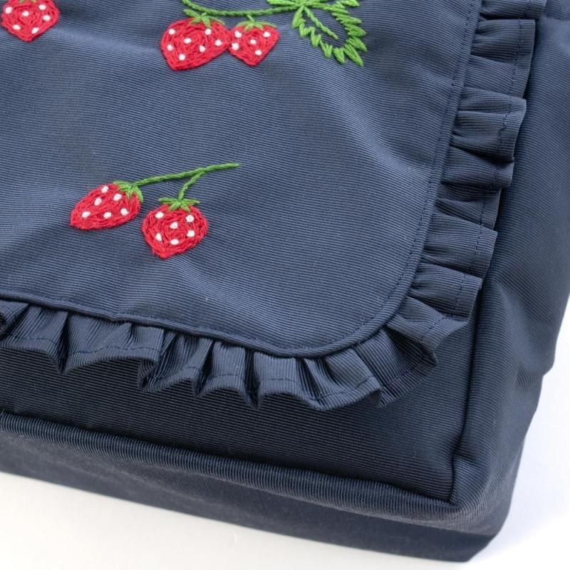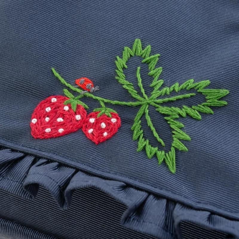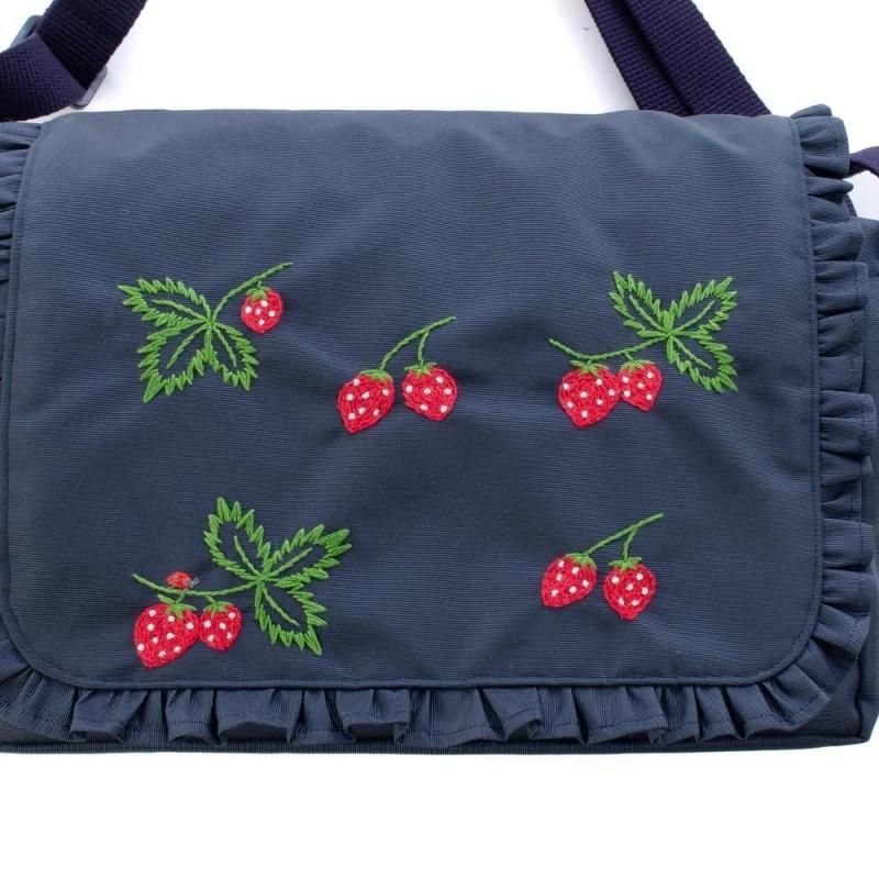 みずみずしい赤いイチゴの刺繍を散りばめたショルダーバッグ。