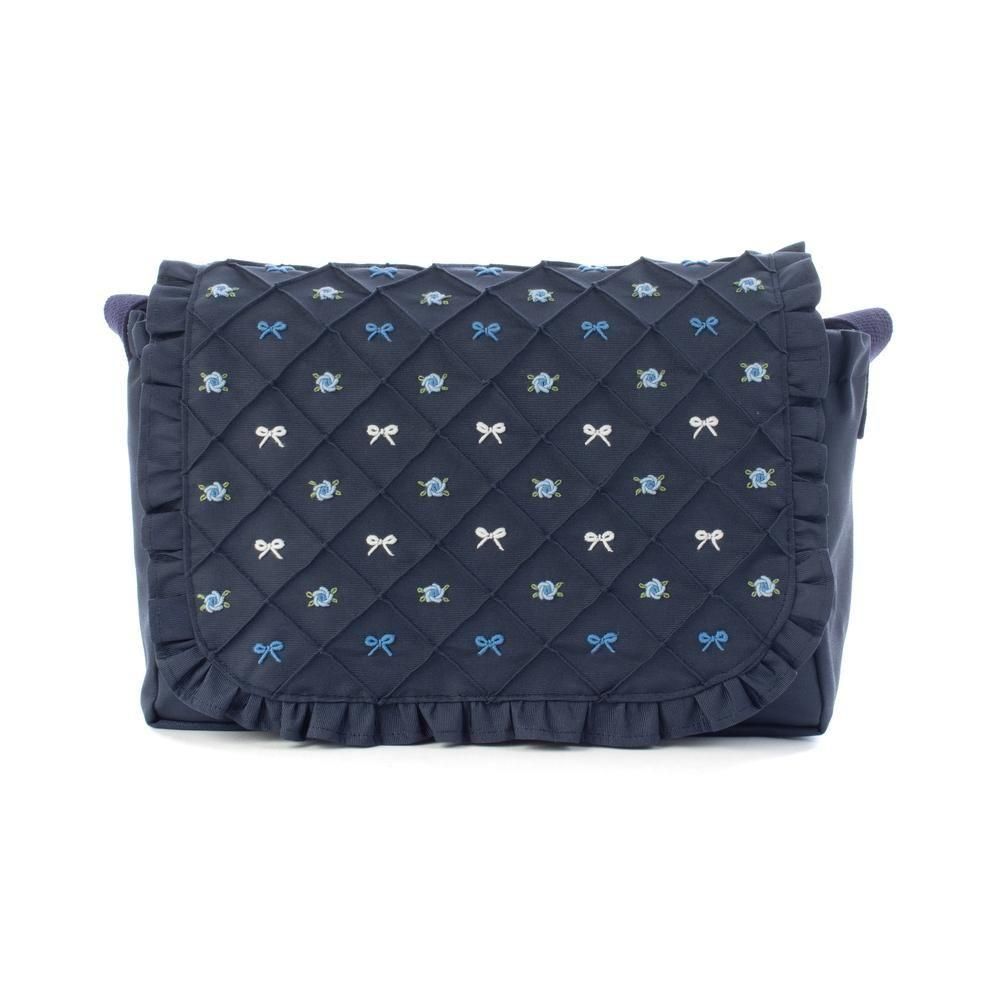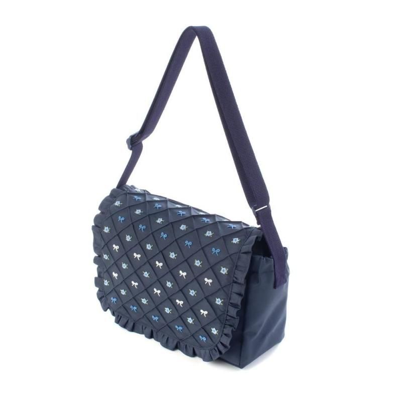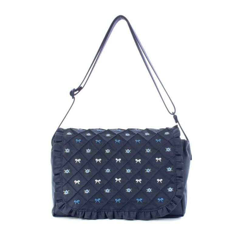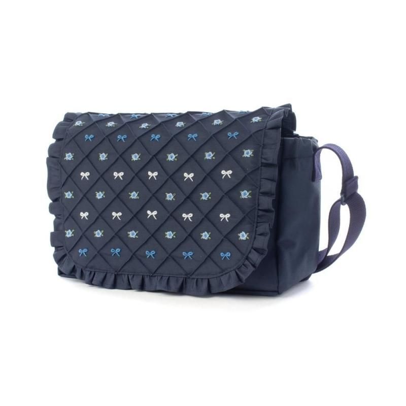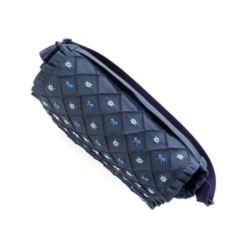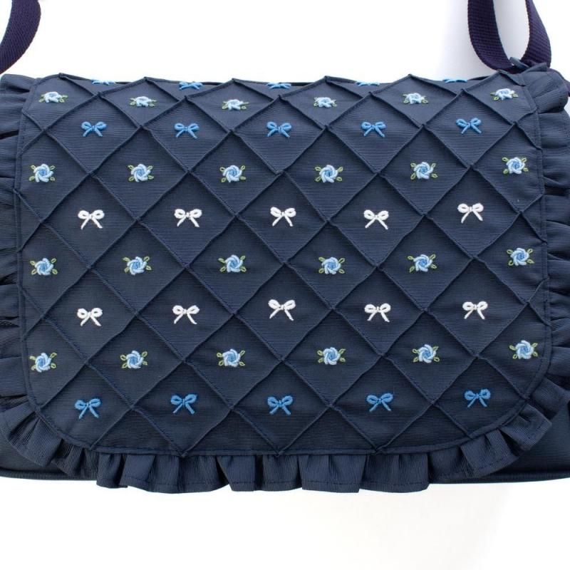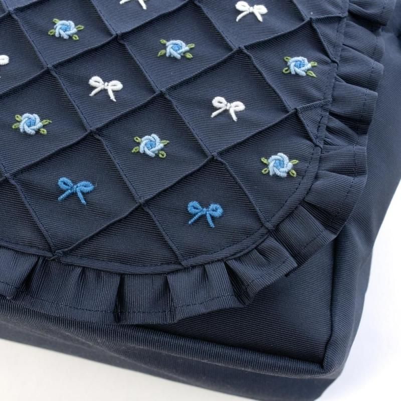 ピンタックに、青い小さなバラと白いリボンの刺繍を散りばめたショルダーバッグ。