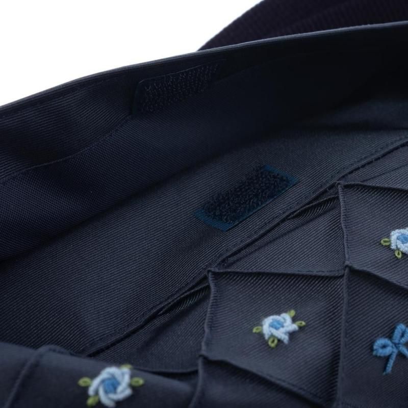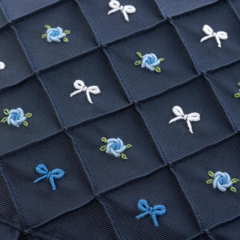ネイビー地に映える繊細なモチーフが、上品で可愛らしい雰囲気を添えます。