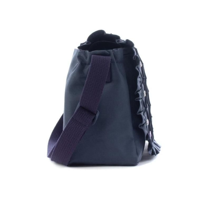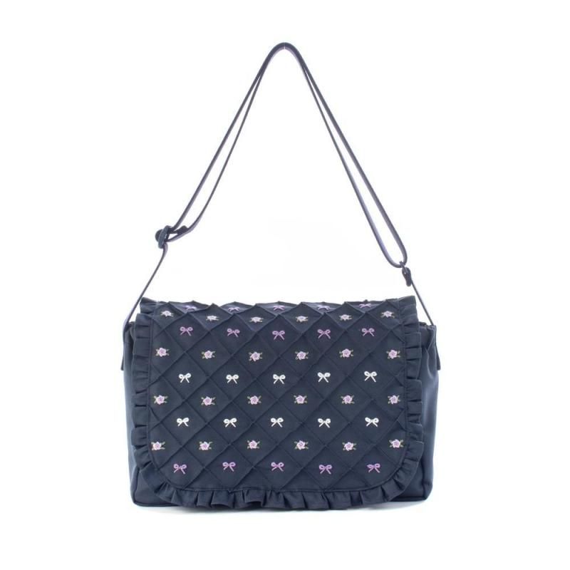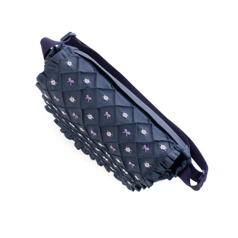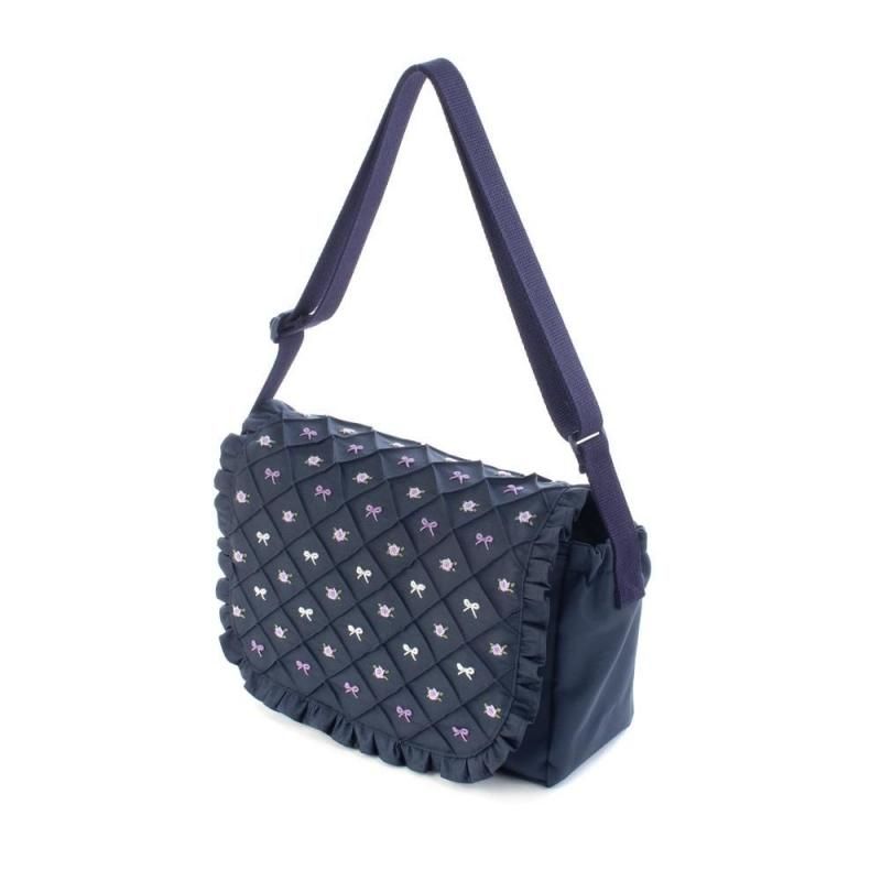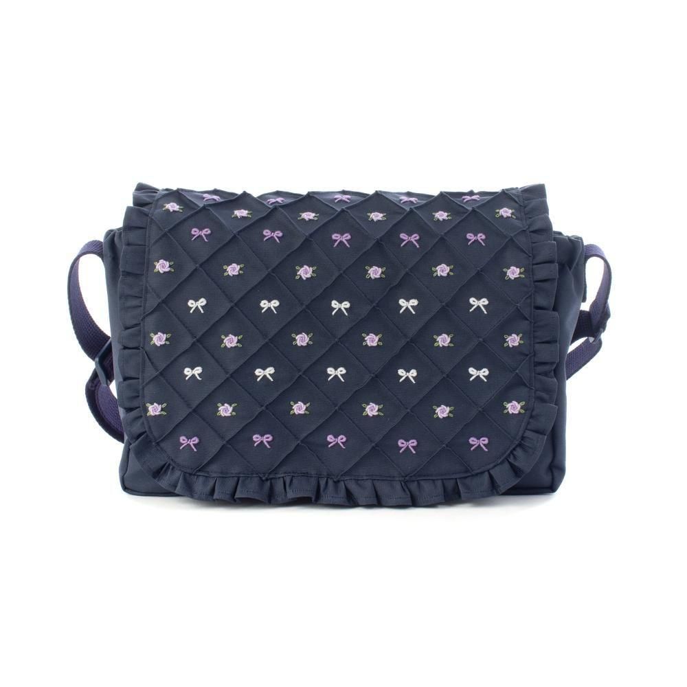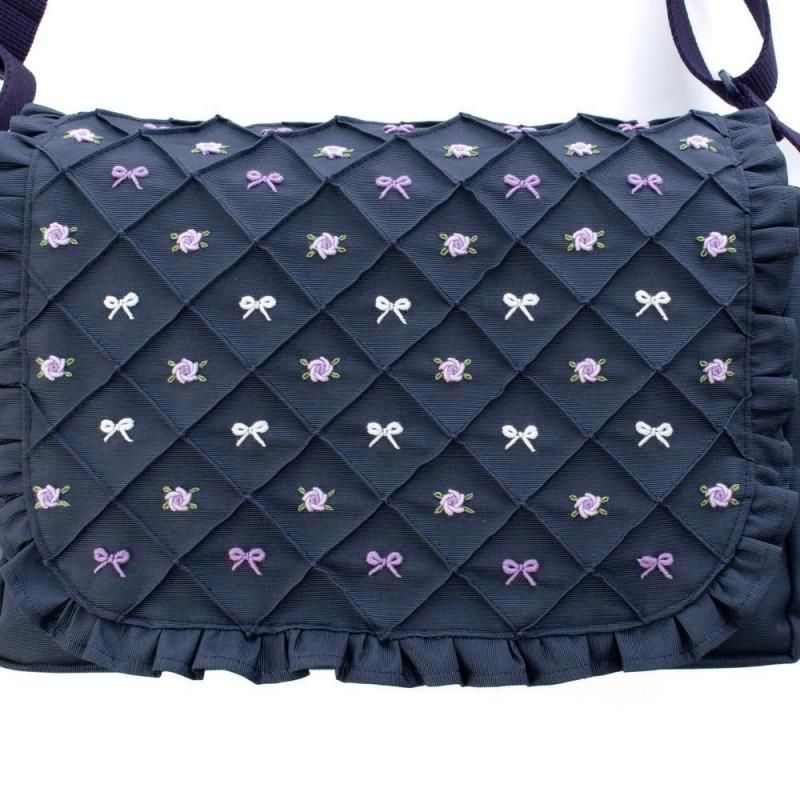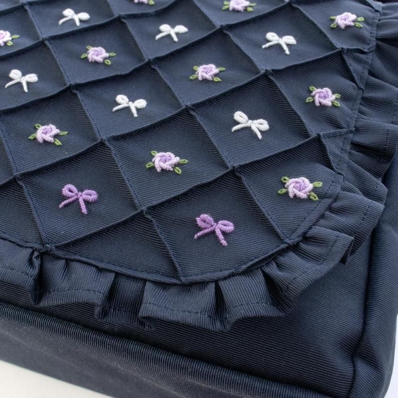 ピンタックに、パープルの小さなバラと白いリボンの刺繍を散りばめたショルダーバッグ。