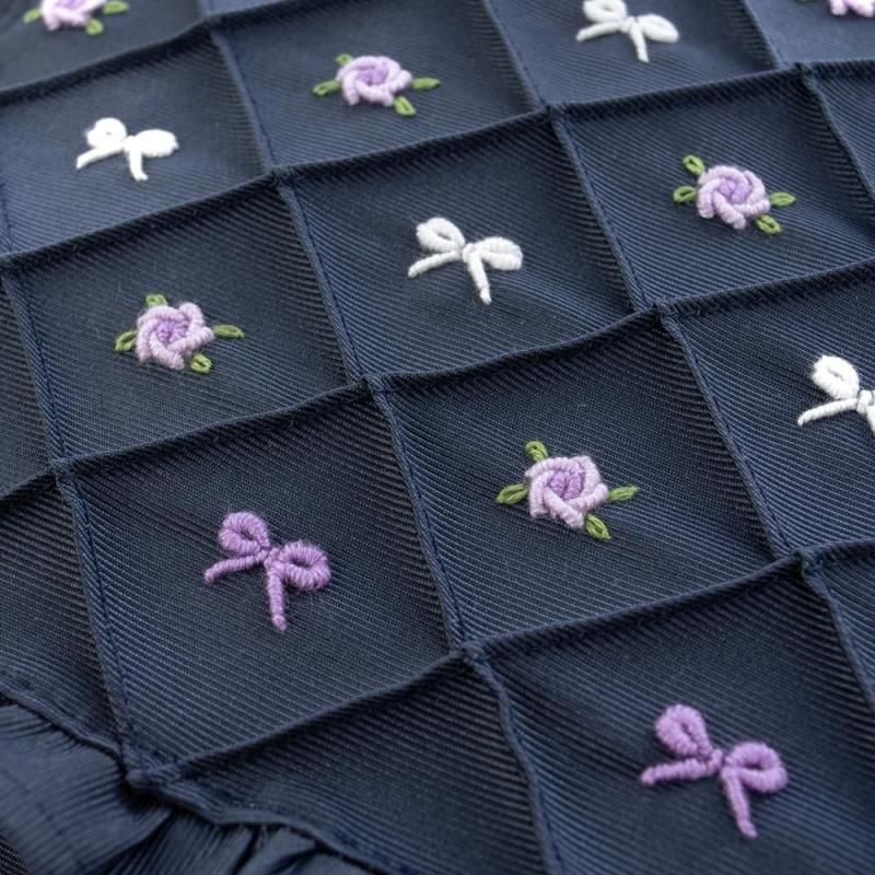 ネイビー地に映える繊細なモチーフが、上品で可愛らしい雰囲気を添えます。