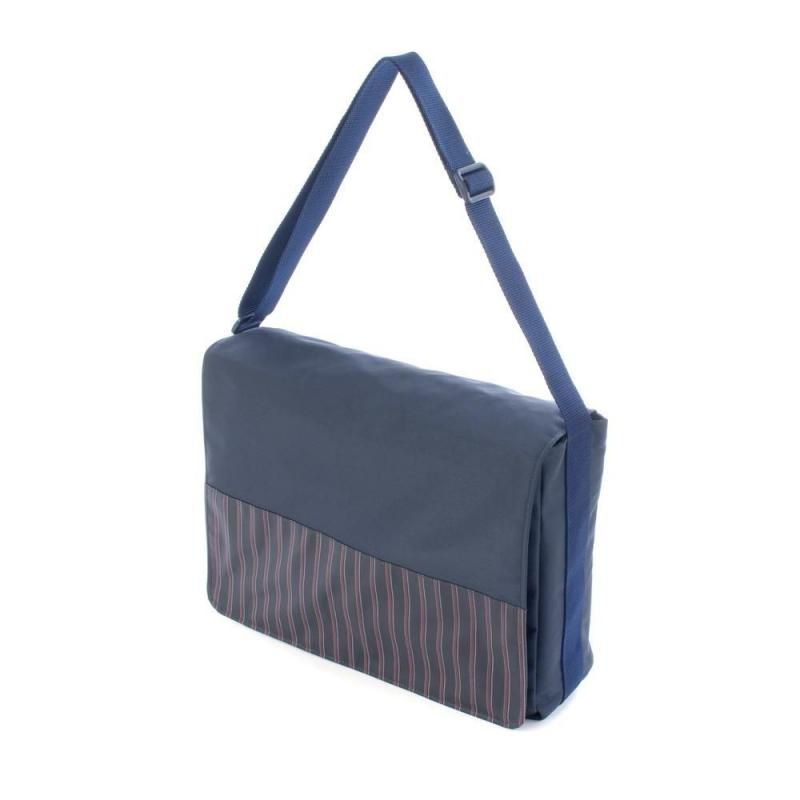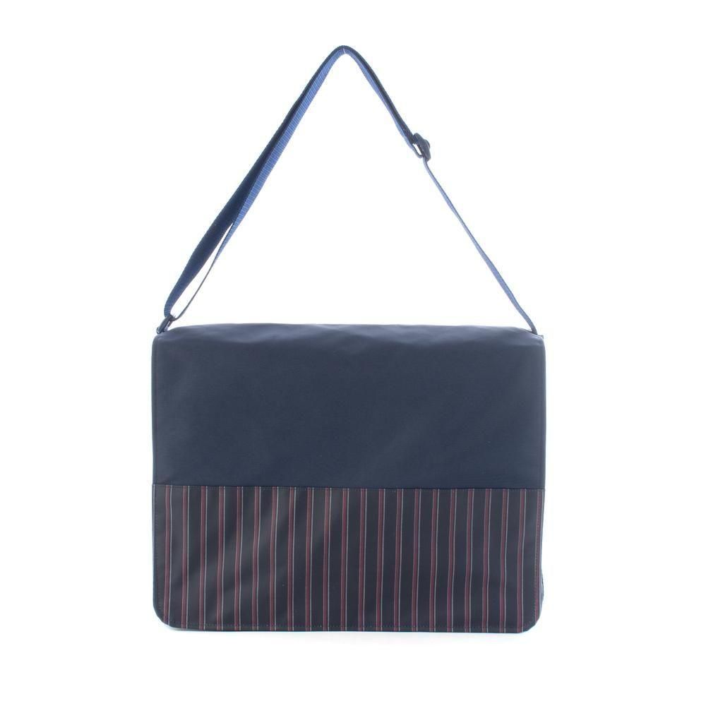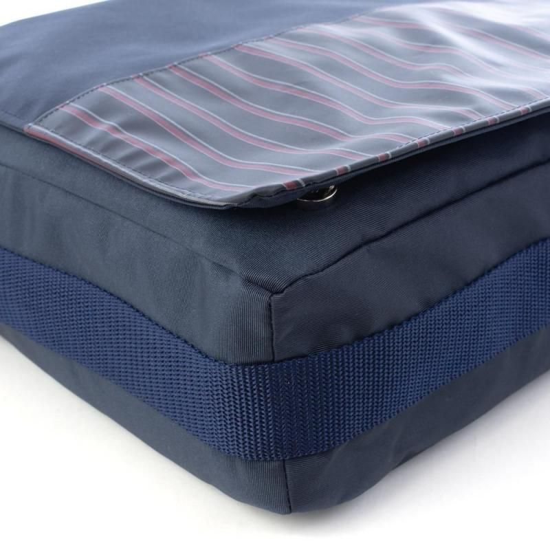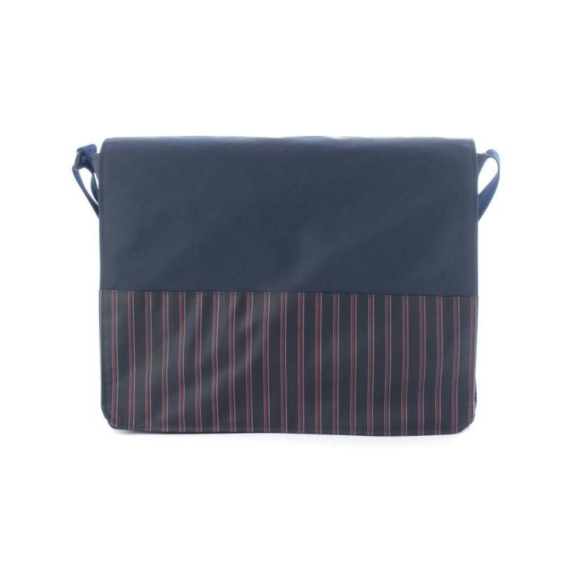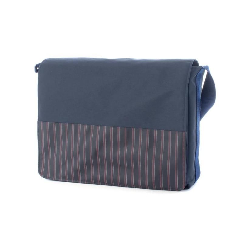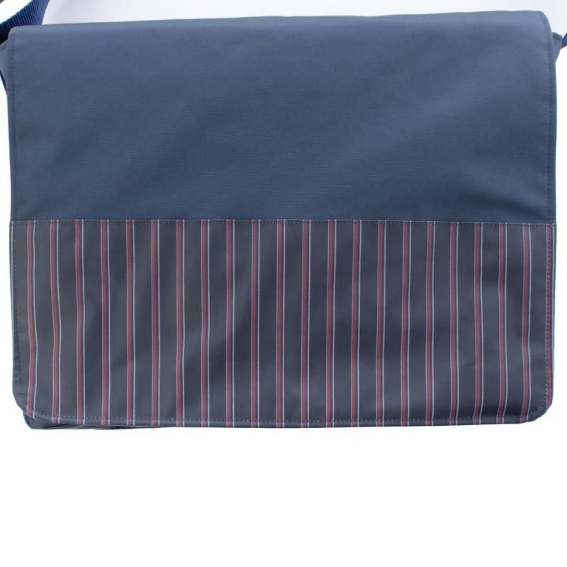 ネイビー地にストライプ柄を組み合わせたショルダーバッグ。