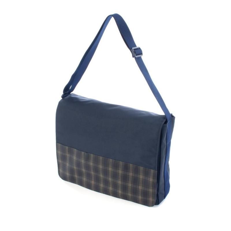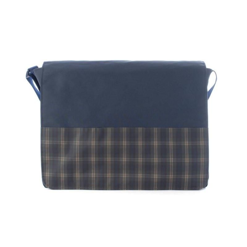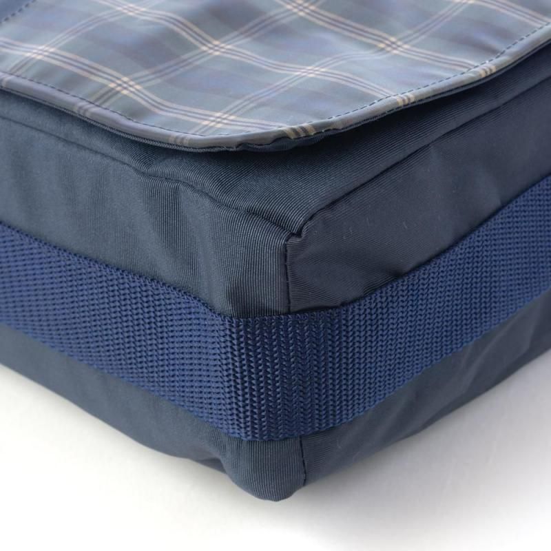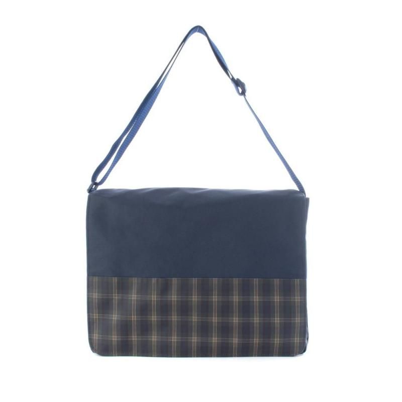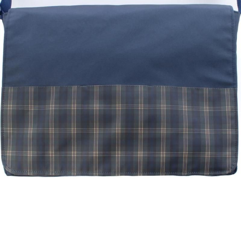 ネイビー地に落ち着いたチェック柄を組み合わせたショルダーバッグ。