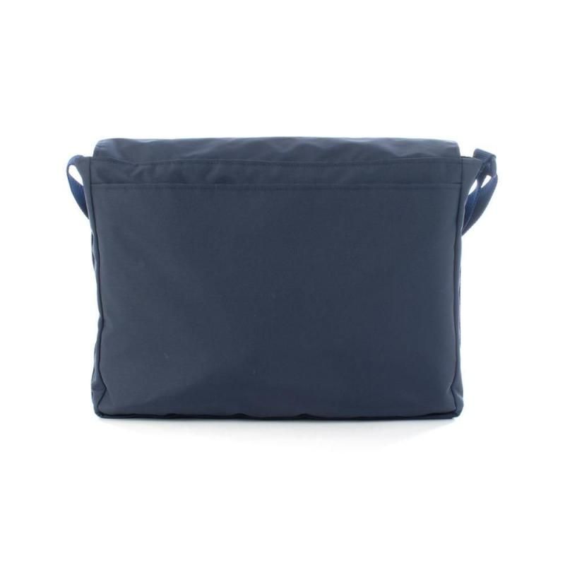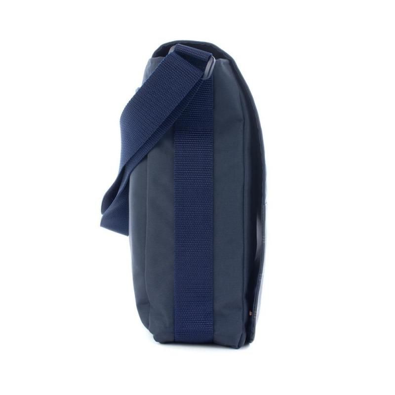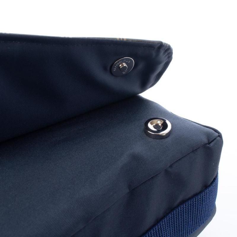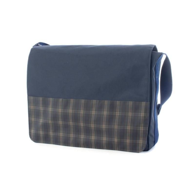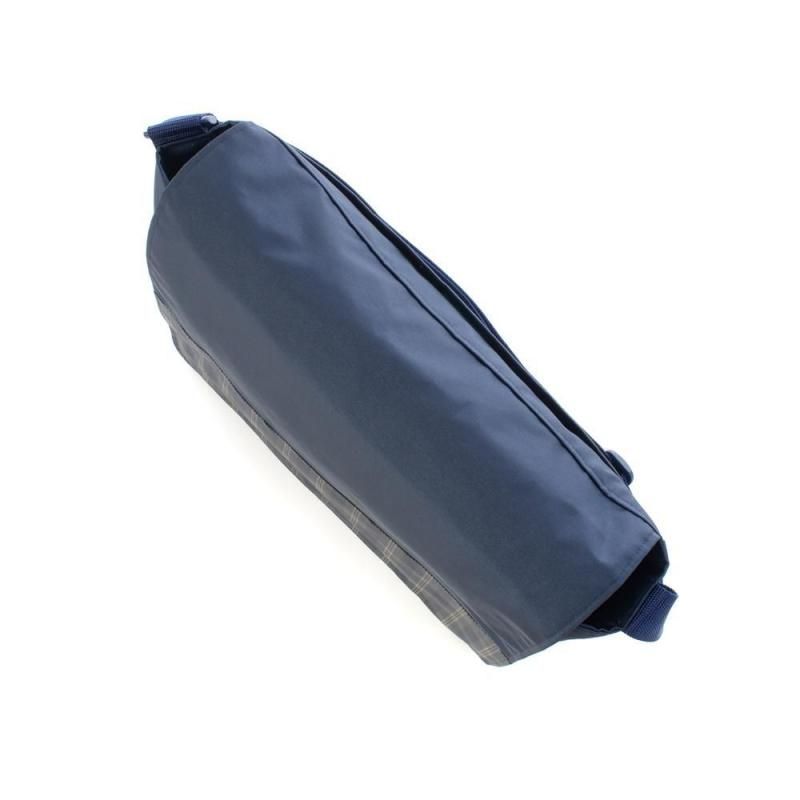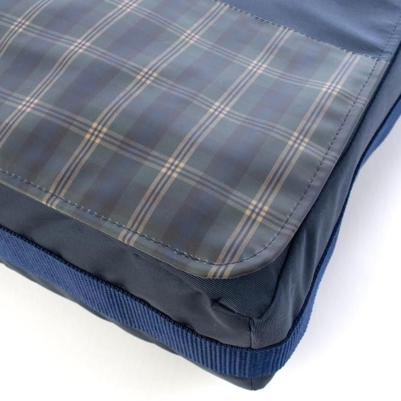 ネイビー地に落ち着いたチェック柄を組み合わせたショルダーバッグ。