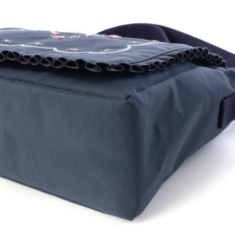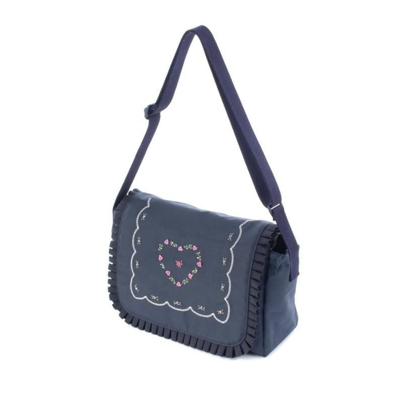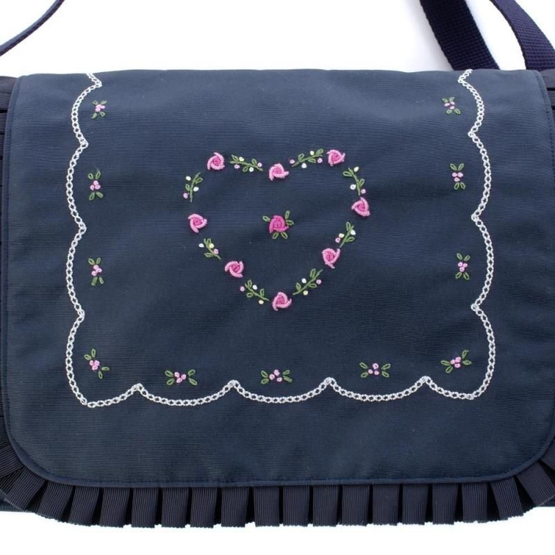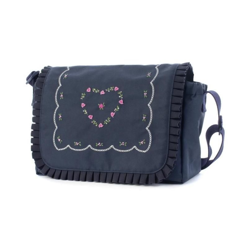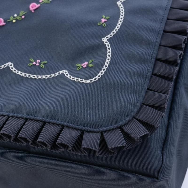 通園におすすめの共布フリルと刺繍入りのお弁当ショルダーです。